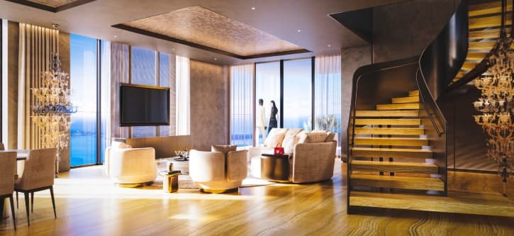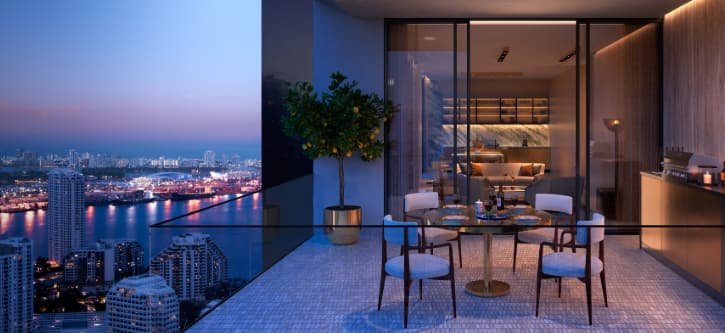 TORRE • Con una altura de 90 pisos, 1,049’‚ una altura récord para Miami • 259 Residencias • Vistas extraordinarias del Océano Atlántico, la Bahía de Biscayne, y Miami Beach • exterior revestido y fachada en negro brillante Precios 2025